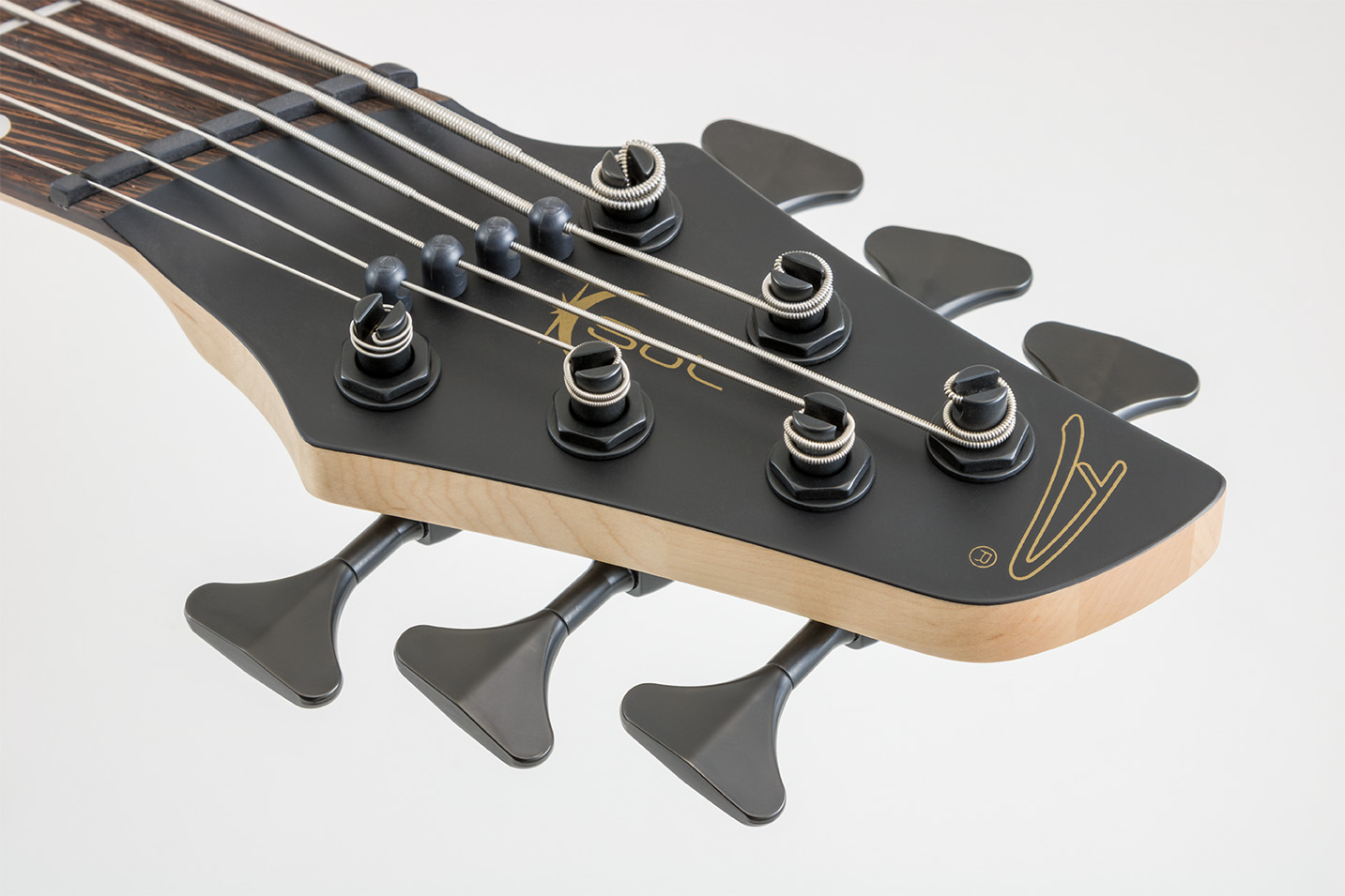 The bolt-on neck is hard rock maple, intended to be more robust for Jacob’s rapid-fire technique. It’s reinforced with carbon fibre, which helps keep any unwanted neck movement to a minimum. The multi-scale wenge fingerboard also keeps the bottom end tight, the top end clear, plus it helps with intonation and comfort.