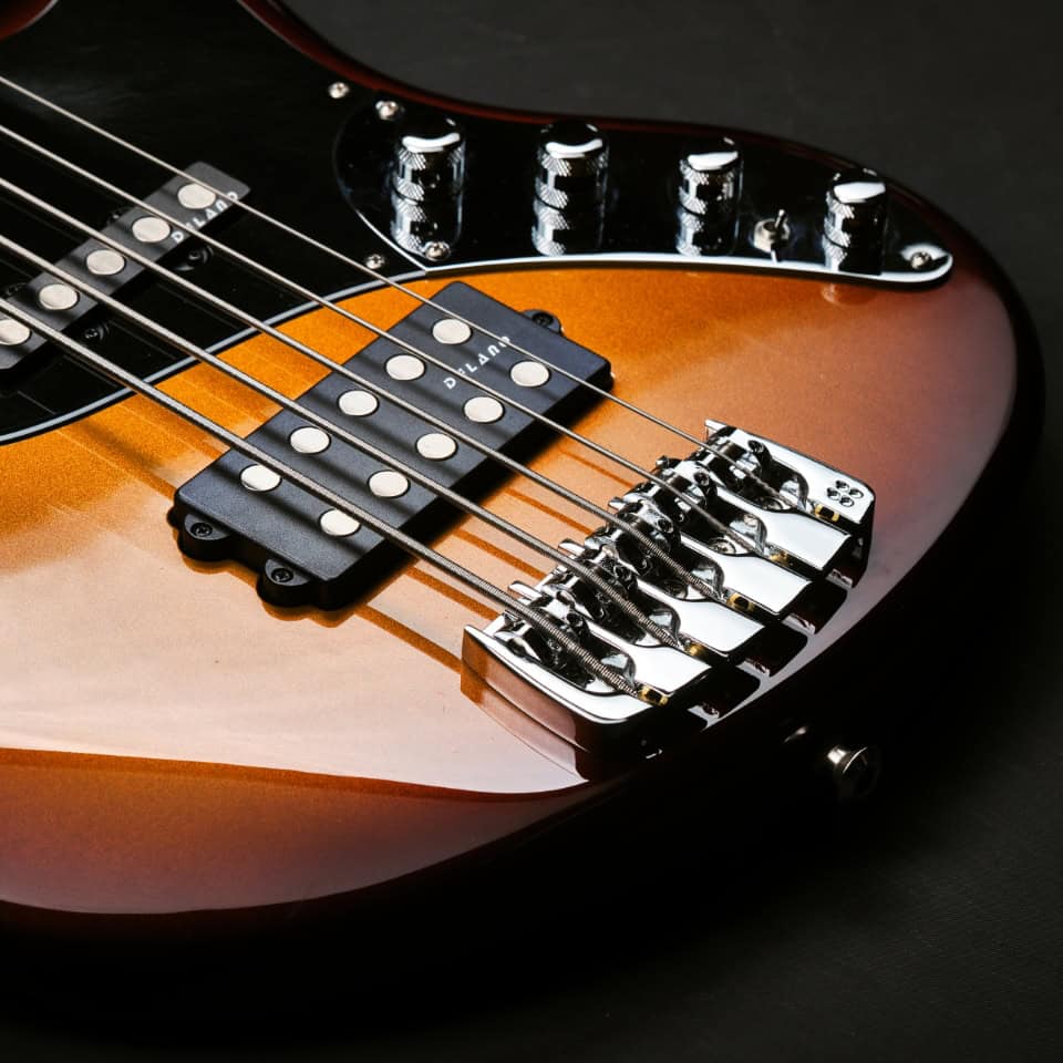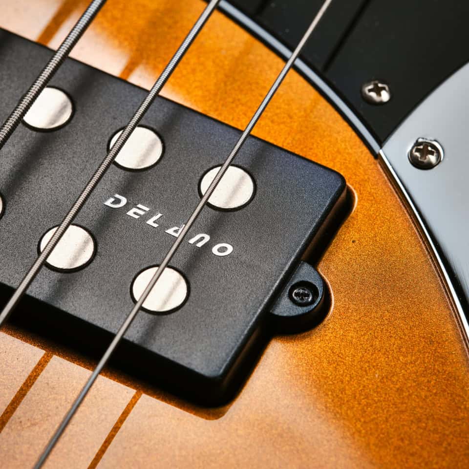 The pickups are one single coil and a humbucker from Delano that form a very organic relationship with the bass for a natural and beefy tone. You can switch between single coil mode or humbucker mode on the humbucker bridge pickup.