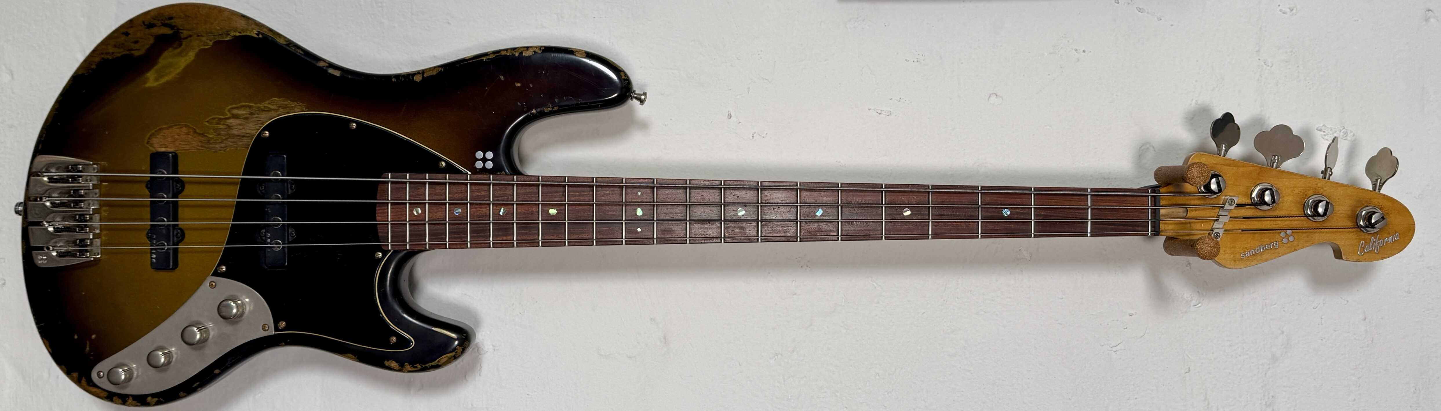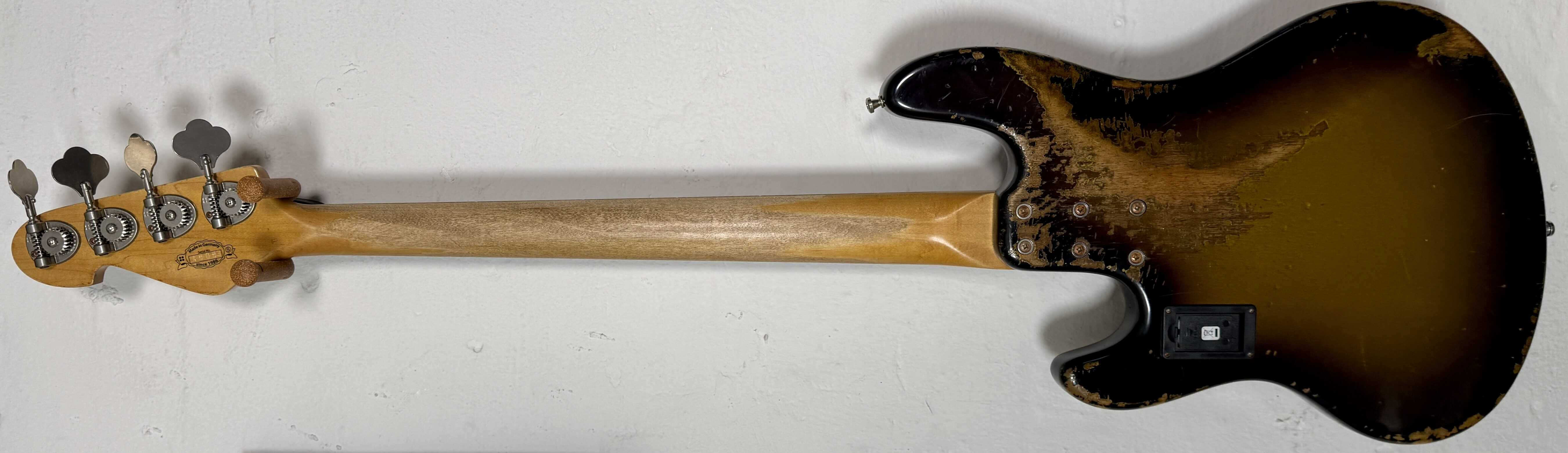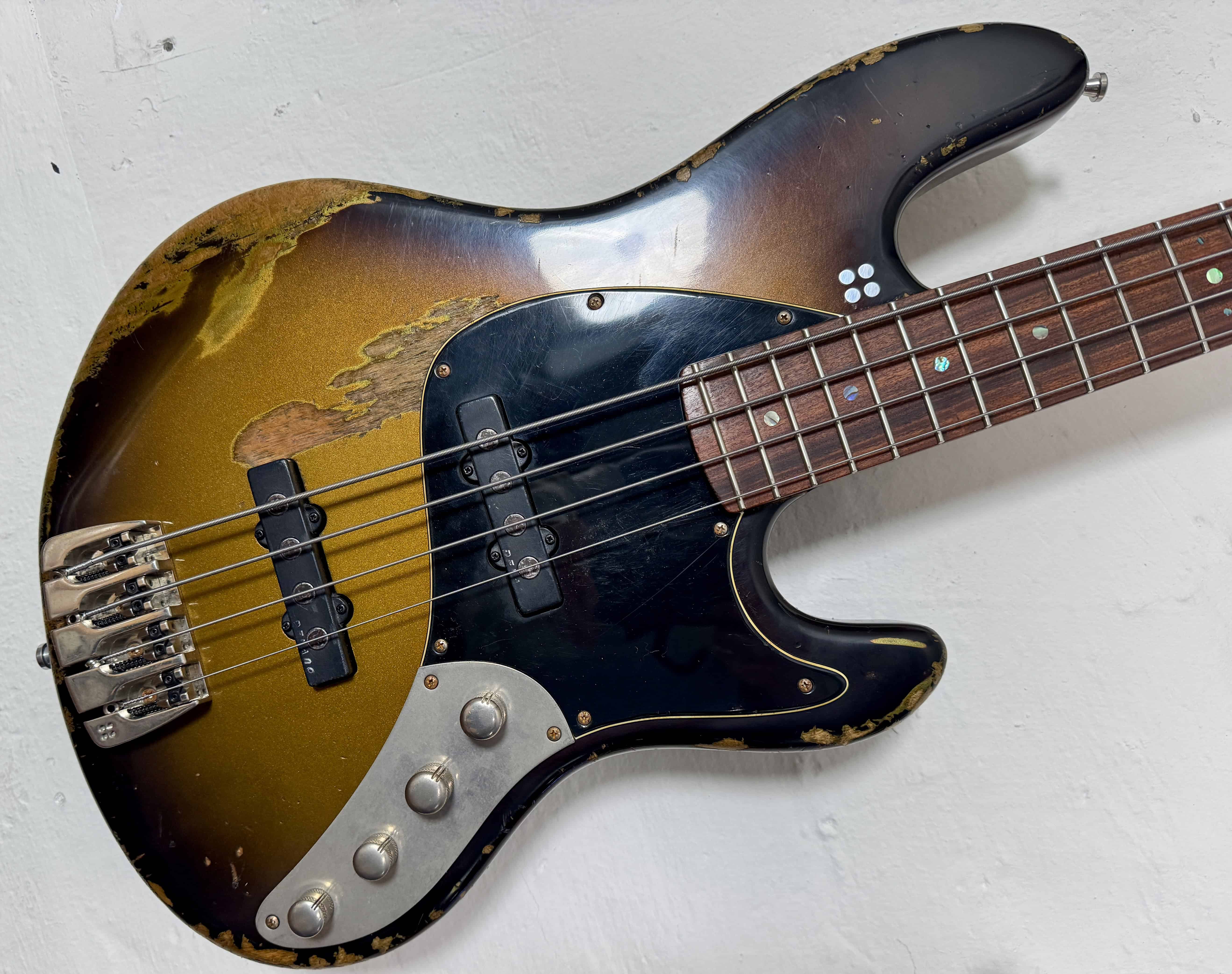 The Gold Burst finish under the heavy aging is stunning. Underneath the chips and wear, you can see the burst transition from dark edges to a warm gold center, and the natural alder grain peeks through wherever the finish has been worn away. The black pickguard and aged chrome control plate add contrast, and the overall effect is of a bass with decades of character. Combined with the aged hardware and the thin, worn finish, this is an instrument that invites you to play without hesitation.